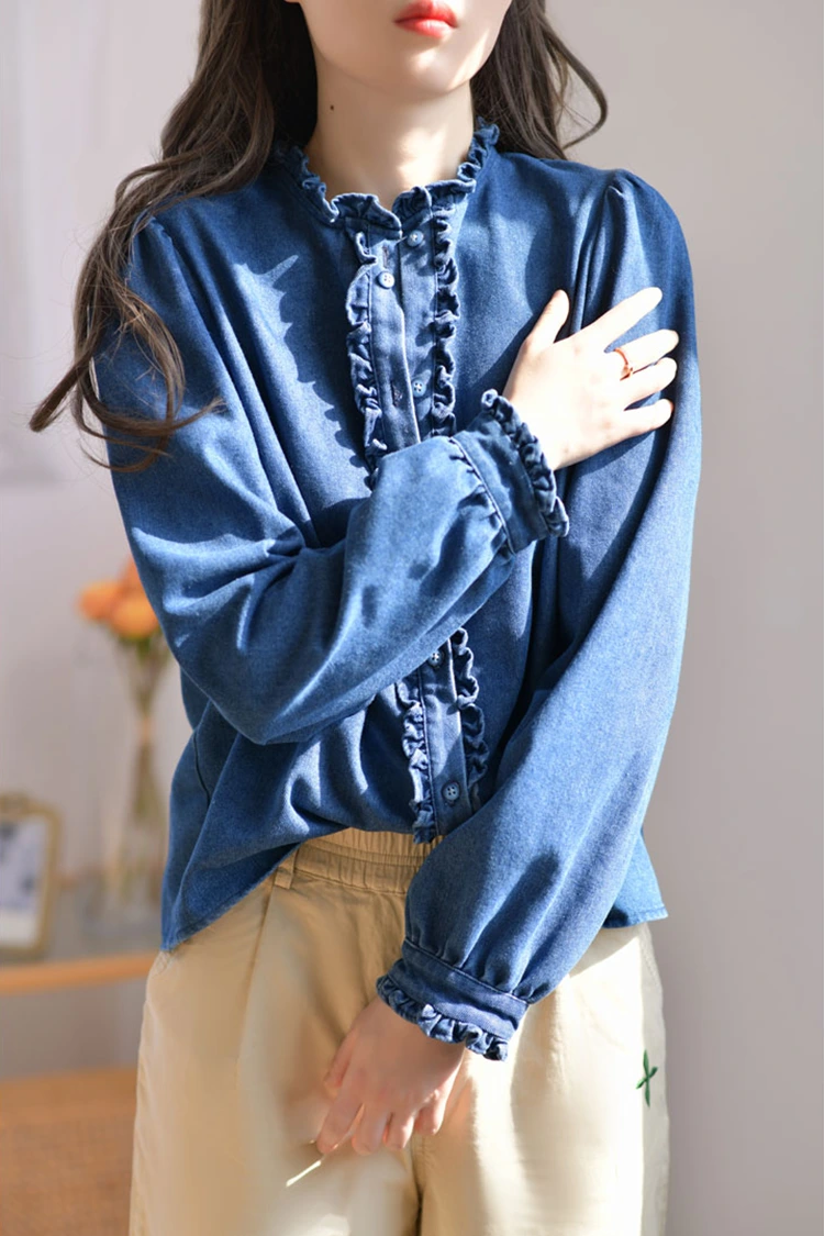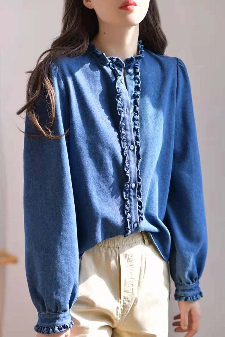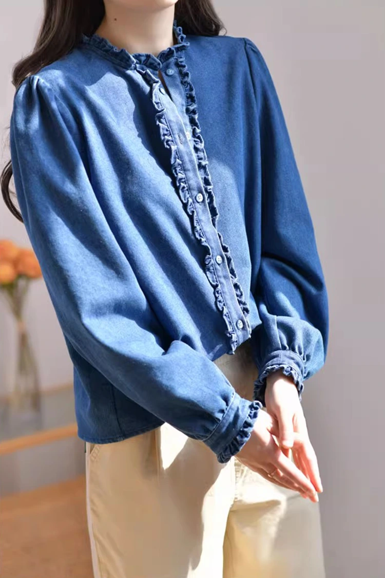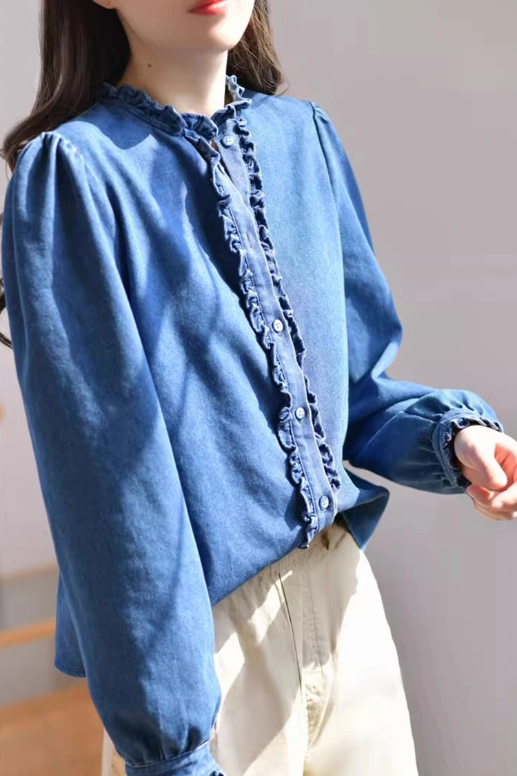 Áo sơ mi denim thông thường dành cho nữ áp dụng thiết kế hoa văn cổ điển và giản dị, vừa vặn chính xác với hình dáng cơ thể phụ nữ. Nó không phụ thuộc vào loại cơ thể và không chỉ có thể làm thon gọn đường nét ở vai và cổ mà còn che đi phần mỡ thừa ở eo và bụng. Nó đáp ứng nhu cầu của các loại cơ thể khác nhau. Cổ áo được thiết kế dạng cổ đứng, kết hợp với viền bèo nhún tinh tế. Khe hở phía trước và cổ tay áo cũng được trang trí bằng những đường viền xù tinh tế. Kết hợp với tay áo dài mềm mại và hình đèn lồng, nó kết hợp hoàn hảo giữa nét sang trọng cổ điển và sự thoải mái thường ngày. Mẫu màu trơn đơn giản mang tính cổ điển và bền bỉ, sẽ không bị lỗi mốt. Nó có thể tạo ra vẻ ngoài giản dị hàng ngày hoặc phong cách kinh doanh đơn giản và có tính ứng dụng cao.