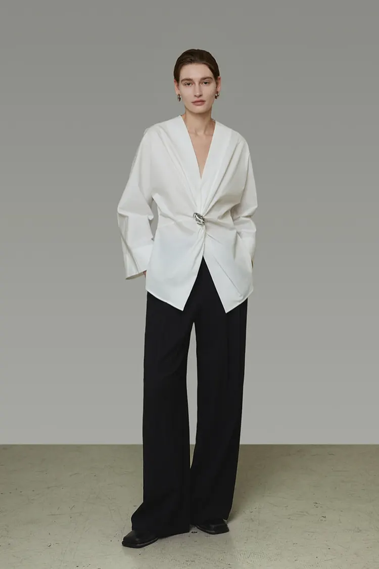 Áo sơ mi nữ mới về mùa xuân – Áo sơ mi chéo phía trước có khóa kim loại, thiết kế nút bất đối xứng, vừa vặn thoải mái & giản dị