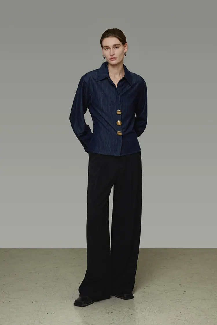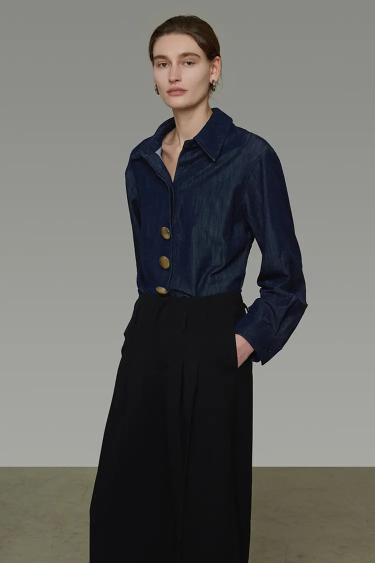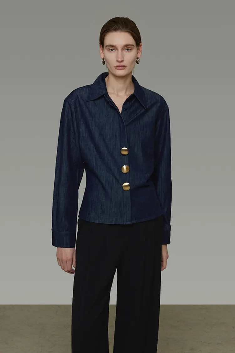 Áo sơ mi denim cổ điển có khuy kim loại dành cho nữ, áo dài tay đa năng đơn giản và tinh tế